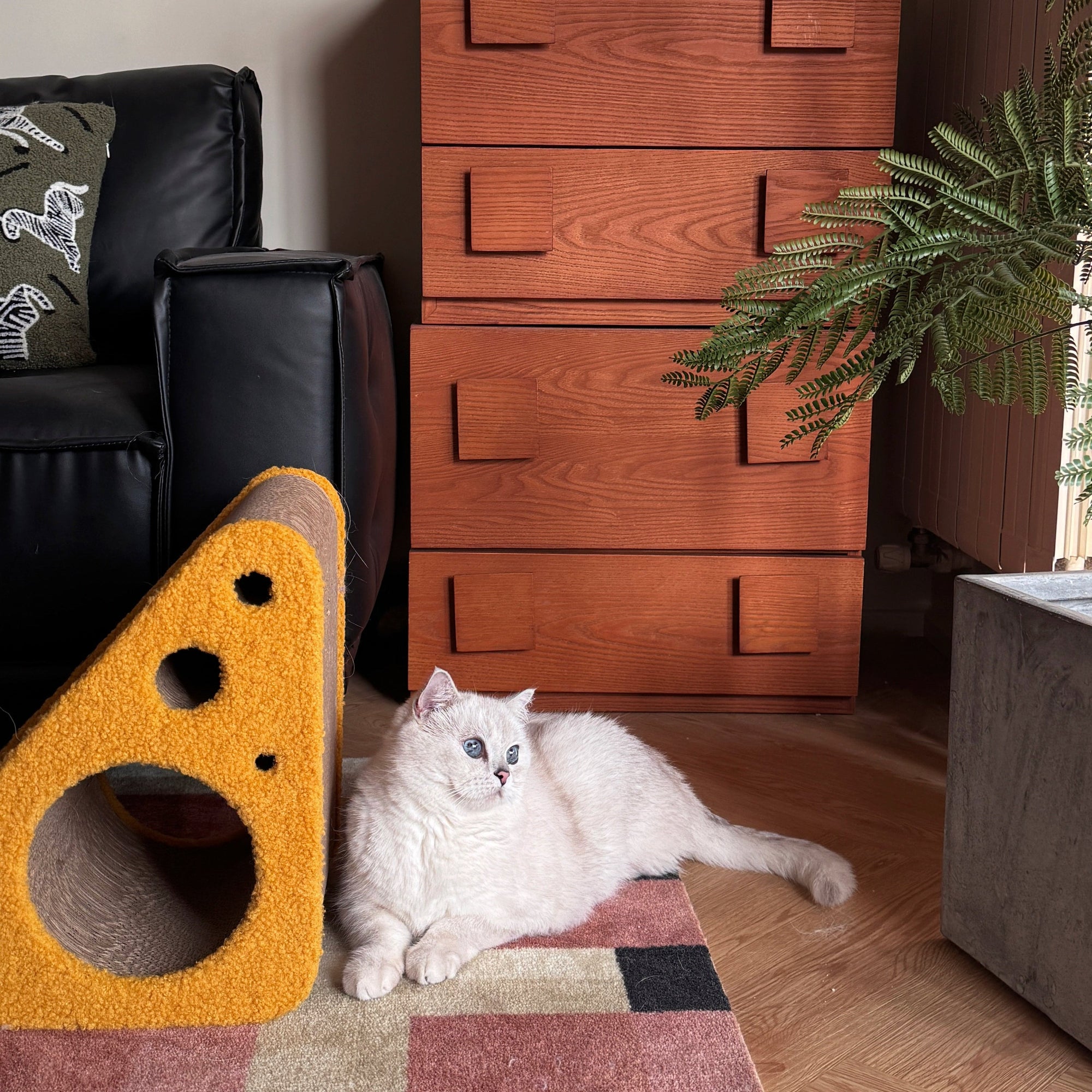 The Cheese Cat Scratcher is a playful, cheese shaped sculpture that brings charm to your home and joy to your cat’s daily routine. Pet JoJo is the first to combine soft, puffy fabric with a cat scratcher, creating a cozy and stylish piece that blends naturally into any space.