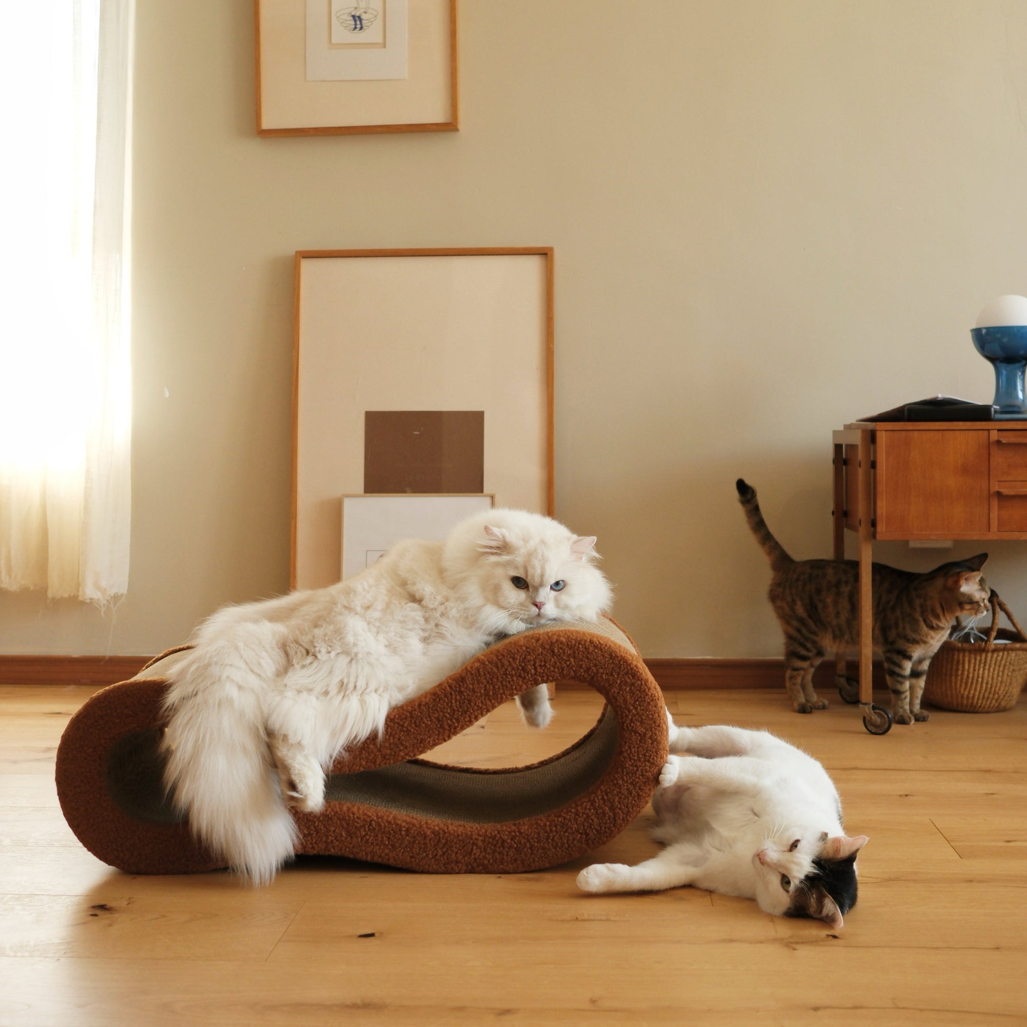Our designer studied how cats lounge, stretch, and move. Through countless tests, the form was refined into a unique shape with shifting angles that invite numerous daily positions. The Cloud’s flowing form turns everyday activity into a graceful rhythm, offering both comfort and engagement.